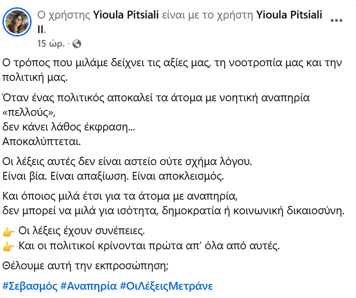 «Όταν η νοητική αναπηρία περιγράφεται με όρους όπως «πελλοί», αυτό δεν είναι αυθορμητισμός. Είναι γλώσσα ξεπερασμένη και προσβλητική — ειδικά το 2026. Και όταν αυτή η γλώσσα συνοδεύεται από «συνεντεύξεις» με μάσημα, γεμάτο στόμα και ήχους φαγητού, δεν μιλάμε για χαλαρό στυλ αλλά για συνολική έλλειψη σεβασμού».