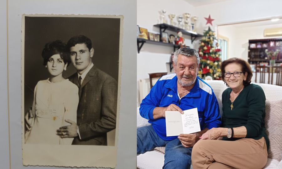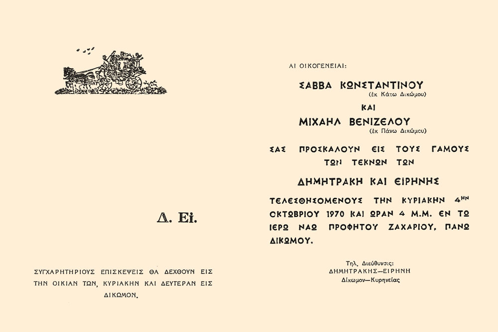 Μέσα σε πολλά έγγραφα και άλλα ιστορικά ντοκουμέντα, που βρέθηκαν στα χέρια μου, υπήρχε και ένα προσκλητήριο γάμου του 1970, ενός γάμου που τελέστηκε στις 4 Οκτωβρίου 1970, στον ναό του Προφήτη Ζαχαρίου στο Πάνω Δίκωμο, στις 4 το απόγευμα. Σκέφτηκα πως σε εμένα δεν θα ήταν χρήσιμο, σίγουρα όμως θα ήταν πολύτιμο για το ζευγάρι που ξεκινούσε μια κοινή ζωή στο κατεχόμενο σήμερα Δίκωμο, που θα έμενε στα όρια του Πάνω και του Κάτω Δικώμου. Ξεκίνησα αμέσως την αναζήτηση, με τη συστολή που νιώθω πως είναι απαραίτητη, άραγε ζουν, είναι καλά… Χρειάζεται τακτ, αισθανόμουν όμως πως έπρεπε να παραδοθεί στους αρχικούς αποστολείς, τον Δημητράκη και την Ειρήνη, έστω και πενήντα πέντε χρόνια μετά. Τελικά, η αναζήτηση ήταν πολύ πιο εύκολη, απ’ ό,τι υπολόγιζα, ένα τηλεφώνημα στην κοινοτάρχισσα του Πάνω Δικώμου κα Μαρία Τσιούρτου ήταν αρκετό για να βρω τον Δημήτρη Κωνσταντίνου και την Ειρήνη Βενιζέλου από το Κάτω και το Πάνω Δίκωμο αντίστοιχα, πρόσφυγες, και κάτοικοι σε έναν από τους συνοικισμούς του Στροβόλου.