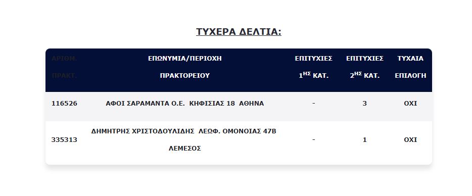 Επίσης, τέσσερα (4) τυχερά δελτία βρέθηκαν στη 2η κατηγορία (5), τα οποία κερδίζουν το ποσό των €100.000,00 για κάθε επιτυχία. Το ένα τυχερό δελτίο παίχτηκε στην Κύπρο και συγκεκριμένα στη Λεμεσό.