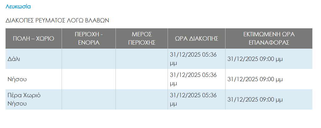 Διακόπηκε το ρεύμα στις περιοχές Δάλι, Νήσου και Πέρα Χωριό Νήσου της Λευκωσίας, σήμερα το απόγευμα, σύμφωνα με ανακοίνωση της ΑΗΚ.