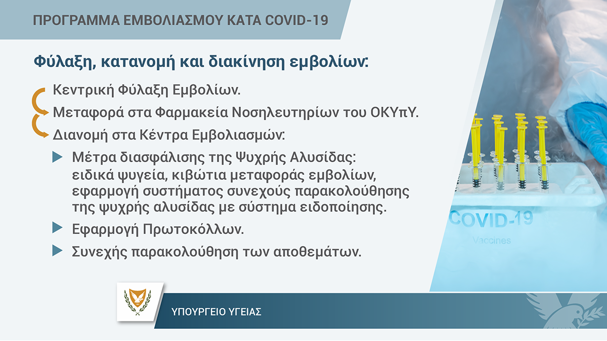 Η φύλαξή τους θα είναι κεντρική και θα μεταφέρονται στα Φαρμακεία του Οργανισμού Κρατικών Υπηρεσιών Υγείας, όπου στη συνέχεια θα διοχετεύονται στα 38 Κέντρα Εμβολιασμού που υπάρχουν παγκύπρια, αλλά και σε άλλους χώρους όπου πιθανόν να γίνουν εμβολιασμοί.