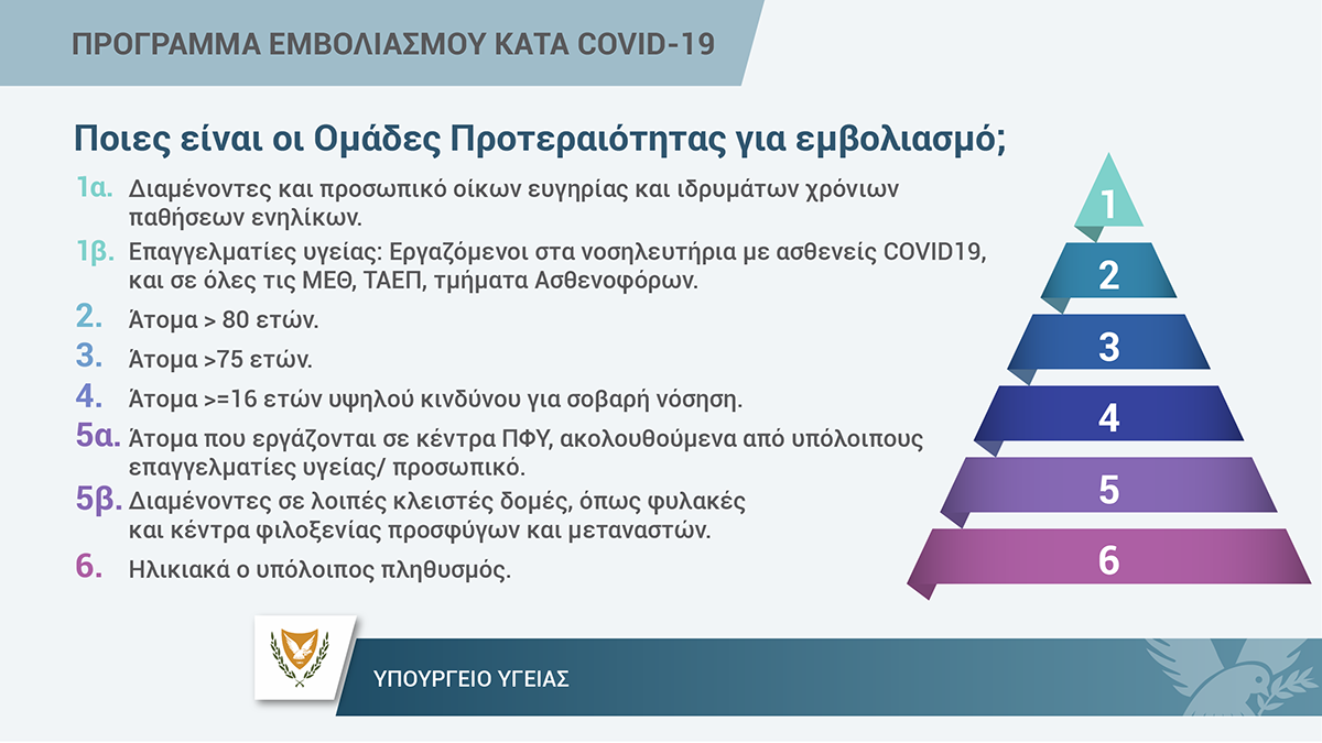Σε συνεργασία με τη Συμβουλευτική Επιστημονική Επιτροπή για τον κορωνοϊό, αλλά και στη βάση των κλινικών μελετών που διενήργησε η κάθε εταιρεία, έχει γίνει ένας κατάλογος προτεραιροποίησης των ομάδων του πληθυσμού που θα κληθούν να λάβουν το εμβόλιο.
