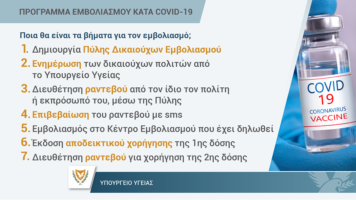 Ο εμβολιασμός θα γίνεται με ονομαστικό ραντεβού, το οποίο θα μπορεί να προγραμματιστεί από το ίδιο το άτομο ή εκπρόσωπό του μέσω του Λογισμικού Προγράμματος Εμβολιασμού.
