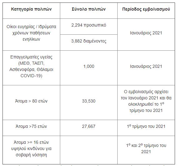 Υπό τις προϋποθέσεις ολοκλήρωσης των διαδικασιών έγκρισης των αιτήσεων για αδειοδότηση και κυκλοφορία των εμβολίων από τον Ευρωπαϊκό Οργανισμό Φαρμάκων και τη διανομή τους στα κράτη μέλη και χωρίς να διαφοροποιηθούν οι ποσότητες που έχουν δεσμευτεί να δοθούν σε κάθε παρτίδα, οι εμβολιασμοί αναμένεται να γίνουν ως ακολούθως: