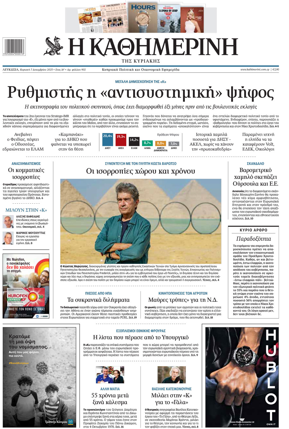 Η Καθημερινή παρουσιάζει το Πολιτικό-οικονομικό βαρόμετρο του Χειμώνα. Ποια είναι η πρόθεση ψήφου σήμερα στις επερχόμενες βουλευτικές εκλογές; Ποιο κόμμα έρχεται πρώτο και ποια κινδυνεύουν με διάλυση; Ανεβαίνουν ή πέφτουν τα ποσοστά Οδυσσέα και Φειδία; Πώς θα ήθελε ο κόσμος του ΑΚΕΛ να δει το κόμμα να εξελίσσεται; Πώς «βαθμολογείται» η κυβέρνηση στα θέματα της καθημερινότητας αλλά και στην εξωτερική πολιτική; Οι πολίτες εγκρίνουν ή απορρίπτουν τον τρόπο που ασκεί τα καθήκοντα του ο Νίκος Χριστοδουλίδης; Και ποια μορφή λύσης του Κυπριακού προκρίνουν σήμερα; Αυτή την Κυριακή με την Καθημερινή η μεγάλη έρευνα – βαρόμετρο για την Καθημερινή από τις Stratego - IMR.