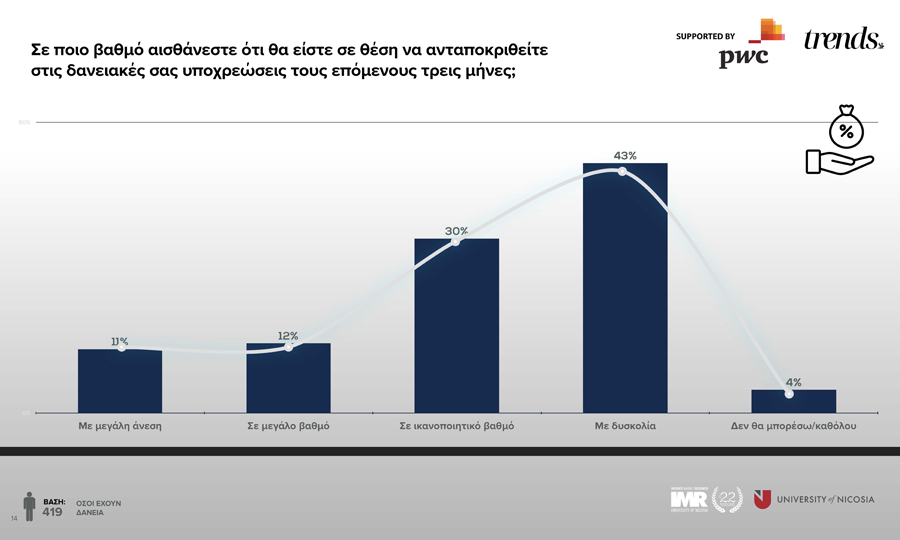 Σταθεροποίηση του οικονομικού κλίματος προβλέπουν τα νοικοκυριά σε σχέση με την επόμενη τριμηνία. Αν πρέπει να διαλέξουμε πλευρά η επόμενη προτίμηση είναι στην μικρή χειροτέρευση της κατάστασης την οποία προβλέπει το 32% των ερωτηθέντων. Με βάση τις απαντήσεις την μεγαλύτερη ανασφάλεια φαίνεται να βιώνουν οι συνταξιούχοι αφού σε ποσοστό 38% αναμένουν χειροτέρευση των οικονομικών τους συνθηκών. Σε γενικές γραμμές οι απαντήσεις στο συγκεκριμένο ερώτημα αν συγκριθούν με προηγούμενες μετρήσεις παραπέμπουν σε μεγαλύτερη αισιοδοξία των ερωτηθέντων αφού στις απολύτως αρνητικές απαντήσεις υπάρχει μείωση 50% ενώ όσοι βλέπουν σταθεροποίηση αυξήθηκαν κατά 15%.
