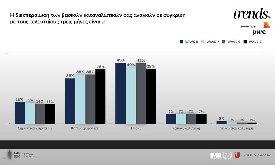 Σε σχέση με το προηγούμενο τρίμηνο τα νοικοκυριά δεν αναμένουν μεταβολή των οικονομικών τους συνθηκών μιας και τόσο οι τιμές όσο και μισθοί δεν παρουσιάζουν ουσιαστική μεταβολή. Προβληματίζει πάντως η εικόνα μιας γενικότερης αρνητικότητας που ιχνηλατείτε μεταξύ των ερωτηθέντων στις κατηγορίες του πληθυσμού που συγκεντρώνεται στις παραγωγικές ηλικίες και στα μεγαλύτερα εισοδήματα, κάτι που αναμένεται πως θα επηρεάσει την κατανάλωση βραχυπρόθεσμα. Δυσκολίες εντοπίζονται στον τρόπο διαβίωσης των ατόμων τρίτης ηλικίας κυρίως βασίζονται στην σύνταξη.
