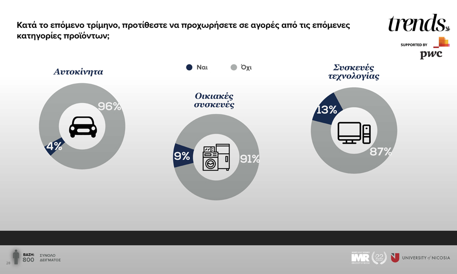 Η ζήτηση για διαρκή καταναλωτικά αγαθά καθοδηγείται από τις οικιακές συσκευές και είναι άμεσα συνδεδεμένη με την ζήτηση για αγορά κύριας κατοικίας. Στην δεύτερη θέση οι συσκευές τεχνολογίας με αρκετή όμως απόσταση από τις λευκές συσκευές. Μια διαπίστωση που δικαιώνει την στρατηγική επιλογή αρκετών αλυσίδων τεχνολογίας να εντάξουν τις λευκές συσκευές στο μείγμα τους. Την τελευταία θέση με αισθητή διαφορά από τις άλλες κατηγορίες καταλαμβάνουν τα αυτοκίνητα ενδεικτικό της μειωμένης αγοραστικής δύναμης των κυπριακών νοικοκυριών.