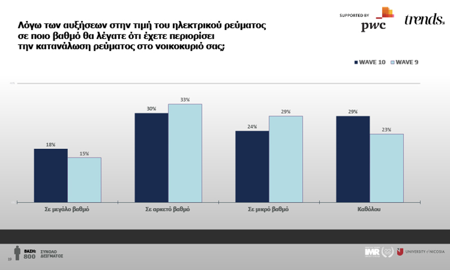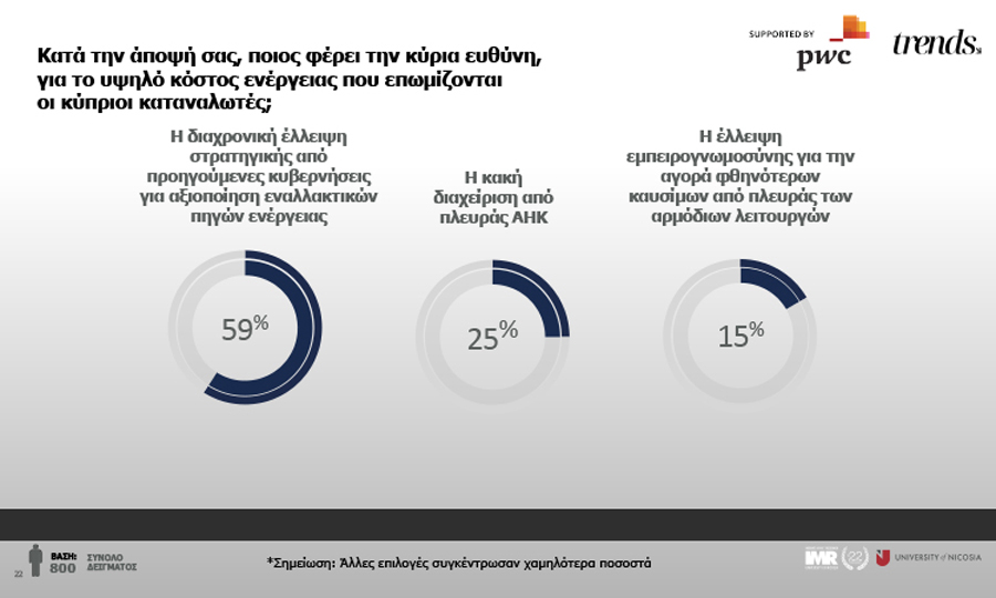 Για το ακριβό ρεύμα οι απαντήσεις, σε ποσοστό 46%, έχουν να κάνουν με ευθύνες που αποδίδονται στην διαχρονική έλλειψη στρατηγικής από προηγούμενες κυβερνήσεις για αξιοποίηση εναλλακτικών πηγών ενέργειας. Δεύτερη στην λίστα των ευθυνών και μεγάλη διαφορά, σε ποσοστό 25%, βρίσκεται η ΑΗΚ ενώ αξίζει να αναφερθεί πως η γεωγραφική θέση της Κύπρου που συχνά γίνεται άλλοθι για τις ακριβές τιμές του ηλεκτρισμού αποτελεί μόλις για το 4% η αιτία για το ακριβό ρεύμα. Σε επαρχιακό επίπεδο ιδιαίτερα επικριτική παρουσιάζεται η Λευκωσία αφού σε ποσοστό 54% οι συμμετέχοντες δηλώνουν πως κύρια αιτία των προβλημάτων είναι η έλλειψη στρατηγικής.