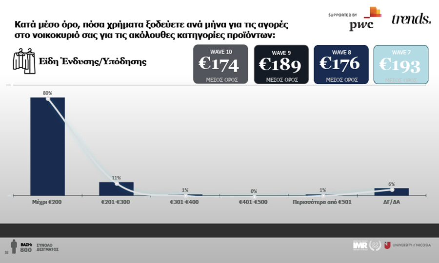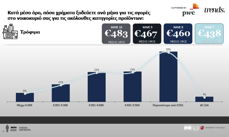 Οι καταναλωτικές συνήθειες των νοικοκυριών σε σχέση με τα ψώνια για τρόφιμα αναδεικνύει πέραν πάσης αμφιβολίας το πρόβλημα της ακρίβειας αφού οι ερωτώμενοι σε ποσοστό 34% δηλώνουν μηνιαία έξοδα άνω των 500 ευρώ. Με πανομοιότυπα ποσοστά, 22%, έρχονται οι επιλογές μηνιαίων εξόδων στο εύρος 300- 400 ευρώ και 400- 500 ευρώ. Η ανά επαρχία ανάλυση κατατάσσει την Λεμεσό πρώτη με 37% στις απαντήσεις για μηνιαία έξοδα σουπερμάρκετ άνω των 500 ευρώ, εξηγώντας και σε αυτή την περίπτωση το ψηλό κόστος ζωής στην πόλη. Η δύσκολη κατάσταση που αντιμετωπίζουν τα νοικοκυριά λόγο ακρίβειας αποτυπώνεται και στις απαντήσεις που δίνουν σε σχέση με τα μηνιαία έξοδα για είδη ένδυσης και υπόδησης, με το 80% να δηλώνει την πρώτη κατηγορία εξόδων, δηλαδή μέχρι 200 ευρώ. Σε σχέση με το κόστος ηλεκτρισμού, 41% των ερωτηθέντων δηλώνουν ότι έχουν περιορίσει την κατανάλωση σε αντίθεση με την πλειοψηφία του 57% που απαντά πως η κατανάλωση ηλεκτρισμού στο νοικοκυριό παραμένει αναλλοίωτη.