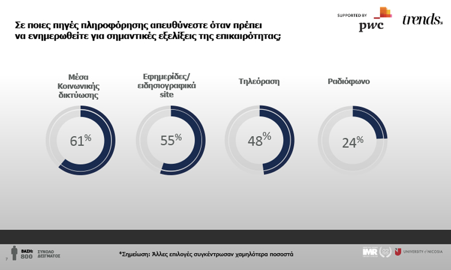 Στην Κύπρο η πλειοψηφία των ερωτώμενων απαντά ότι ενημερώνεται για σημαντικές εξελίξεις από τα μέσα κοινωνικής δικτύωσης. Αυτό το ποσοστό που ανέρχεται στο 51% είναι ανησυχητικό αφού καθιστά την κοινωνία επιρρεπή στα fake news που κατακλύζουν τα μη παραδοσιακά μέσα ενημέρωσης. Δεύτερη στην σειρά πηγή ενημέρωσης, με ποσοστό 44%, είναι τα παραδοσιακά μέσα όπως εφημερίδες και ειδησεογραφικά sites. Σημαντικό εύρημα αφορά στην εμφάνιση της τηλεόρασης στην τρίτη θέση με το πολύ σημαντικό ποσοστό του 30% κάτι που πολύ πιθανόν συνιστά κυπριακή ιδιαιτερότητα λόγο του των ωραρίων της καθημερινότητας και του τρόπου ζωής. Αξίζει να σημειωθεί και το γεγονός ότι η επιλογή των μέσων κοινωνικής δικτύωσης ως κύριο μέσο ενημέρωσης αυξάνεται καθώς ψηλώνει το μορφωτικό επίπεδο.