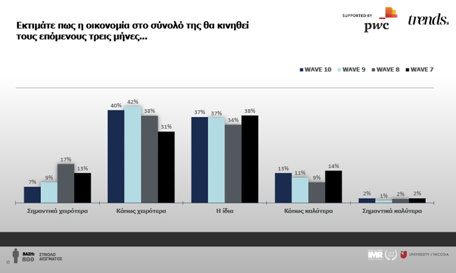 Σε σχέση με τις προσδοκίες οι περισσότεροι ερωτώμενοι αναμένουν χειροτέρευση των συνθηκών σε ποσοστό 40% ενώ το αντίστοιχο ποσοστό ανάμεσα στον γυναίκειο πληθυσμό ανέρχεται στο 50%. Ως δεύτερη επιλογή βρίσκεται η προσδοκία για σταθεροποίηση της κατάστασης με ποσοστό 37%, κάτι όμως που δεν πρέπει να ικανοποιεί κανένα αφού η υφιστάμενη κατάσταση θεωρείται από τους ερωτώμενους άσχημη. Συνεπώς το κυβερνητικό αφήγημα για την Κύπρο που αλλάζει προς το καλύτερο δεν φαίνεται πως είναι κάτι να έχει διαπεράσει το ακροατήριο.