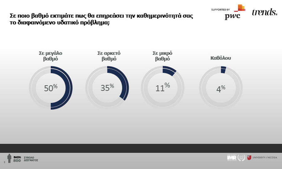Ως πολύ πιεστικό θεωρείται το υδατικό πρόβλημα καθώς οι ερωτώμενοι αναμένουν πως θα τους επηρεάσει σε σημαντικό βαθμό. Συγκεκριμένα η μεγάλη πλειοψηφία που φτάνει σε ποσοστό 84%, ανησυχεί πολύ ενώ η ανάλυση ανά επαρχία, αναδεικνύει ένα αυξημένο φόβο στις επαρχίες Αμμοχώστου και Πάφου λόγο τουριστικής σεζόν. Ως αναμενόταν οι γυναίκες ανησυχούν περισσότερο από τους άντρες, φτάνοντας το ποσοστό ανησυχίας στο 90%. Το πρόβλημα του υδατικού αμβλύνεται σε άτομα με ψηλότερο μορφωτικό επίπεδο, σε καμία περίπτωση το ποσοστό δεν κατεβαίνει κάτω από το 80% καθιστώντας το ένα σημαντικό σε κάθε περίπτωση ζήτημα.