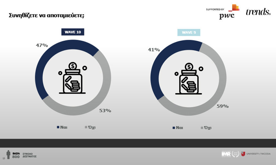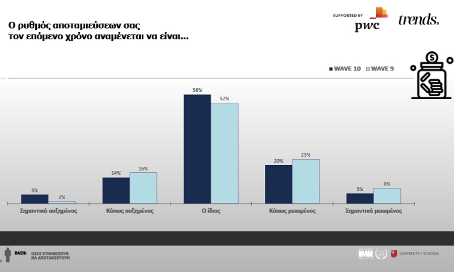 Κατά πλειοψηφία οι ερωτώμενοι δηλώνουν αποταμιευτές σε ποσοστό 57% ενώ για τις γυναίκες ανέρχεται στο 60%. Δημογραφικά οι περισσότεροι αποταμιευτές βρίσκονται στις ηλικιακές ομάδες 25-44 και 18-24. Ανά επαρχία, η Λεμεσός φαίνεται πως παρουσιάζει χαμηλά ποσοστά αποταμιευτών καθώς οι κάτοικοι της πόλης αντιμετωπίζουν αυξημένο κόστος διαβίωσης. Τους περισσότερους αποταμιευτές φαίνεται να «βρίσκουμε» στην Λευκωσία και την Λάρνακα σε ποσοστά 60% και 63% αντίστοιχα. Όσον αφορά στις προοπτικές αποταμίευσης οι ερωτώμενοι σε ποσοστό 56% απαντούν πως περιμένουν σταθερότητα ενώ ως δεύτερη επιλογή είναι η μικρή μείωση.