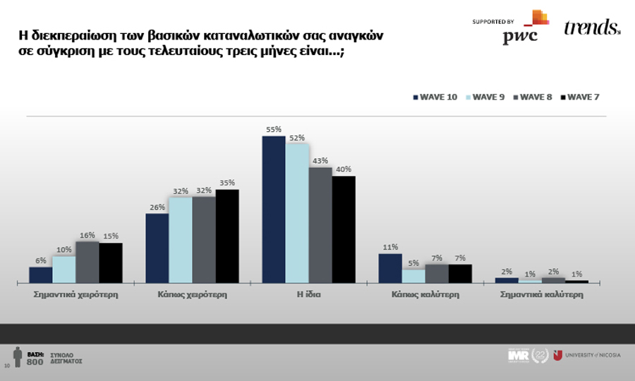 Όσον αφορά στην καθημερινή διαβίωση, οι ερωτώμενοι σε ποσοστό 55% δεν βίωσαν κάποιες αλλαγές τους τελευταίους τρεις μήνες. Η δεύτερη συχνότερη απάντηση με ποσοστό 33%, αφορά σε χειροτέρευση των συνθηκών για διεκπεραίωση των βασικών καταναλωτικών αναγκών σε σχέση με τους προηγούμενους τρείς μήνες. Ακόμη και όσοι δήλωσαν σημαντική βελτίωση είναι κάτω από τους μισούς που δήλωσαν σημαντική χειροτέρευση.