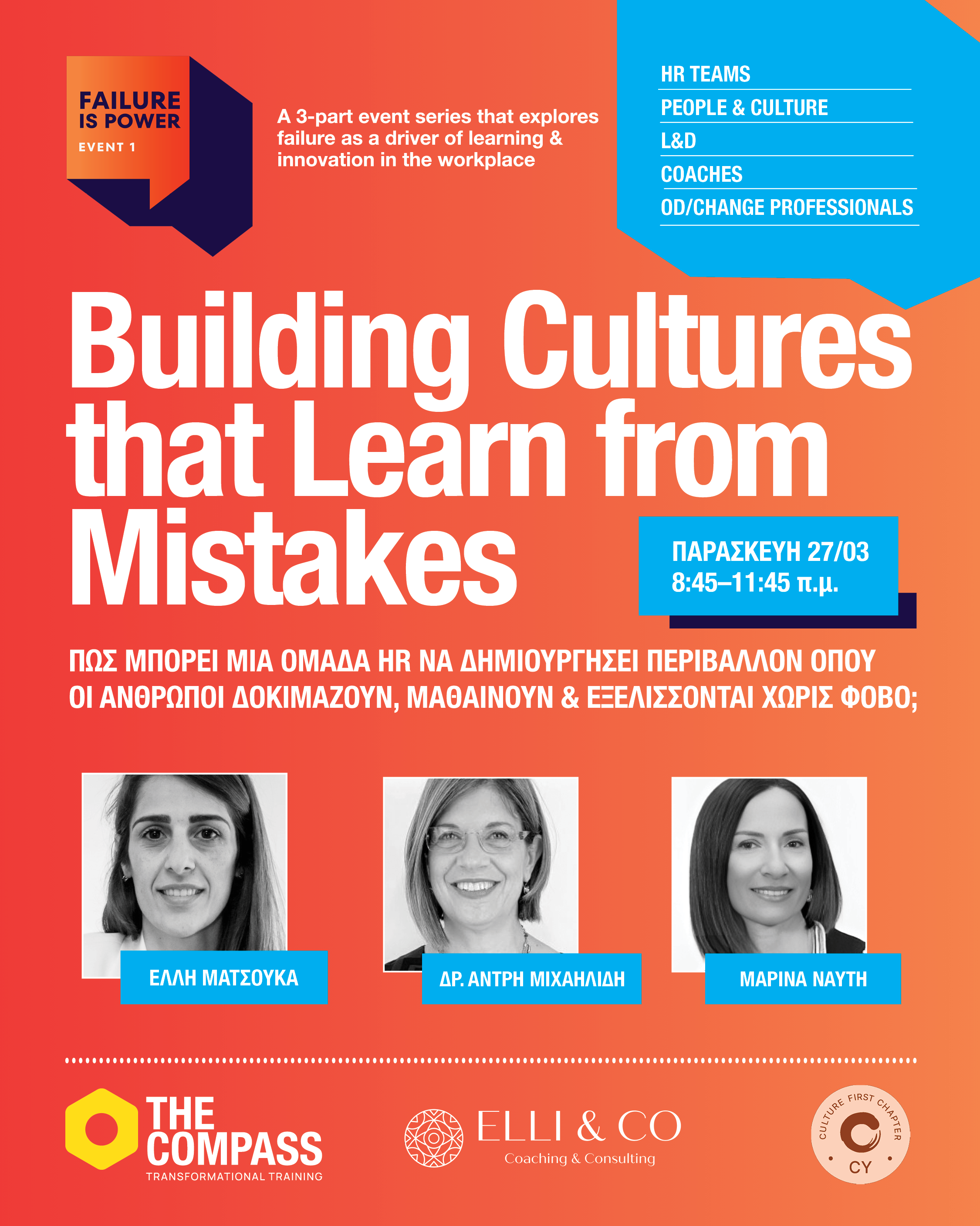 Η πρώτη εκδήλωση απευθύνεται σε επαγγελματίες Ανθρώπινου Δυναμικού και ηγετικά στελέχη από τον ιδιωτικό και δημόσιο τομέα που ενδιαφέρονται για την προσωπική τους ενδυνάμωση και εξέλιξη, αναβαθμίζοντας ταυτόχρονα την κουλτούρα και την απόδοση του οργανισμού τους. Μέσα από τις παρουσιάσεις έμπειρων εκπαιδευτών, οι συμμετέχοντες θα έχουν την ευκαιρία να ενημερωθούν για τους διαφορετικούς τύπους αποτυχίας και να κατανοήσουν την αξία της «έξυπνης αποτυχίας». Ιδιαίτερη έμφαση θα δοθεί στη θωράκιση της ψυχικής ανθεκτικότητας των εργαζομένων, ενώ μέσα από πραγματικά παραδείγματα θα αναδειχθεί η σημασία της εργασιακής κουλτούρας στην ενίσχυση της μάθησης και της καινοτομίας.