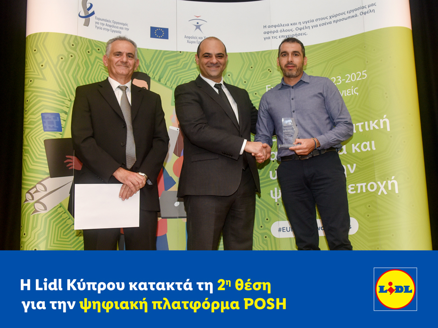 Η Lidl Κύπρου απέσπασε τη 2η θέση στον Διαγωνισμό Παραδειγμάτων Καλής Πρακτικής του Τμήματος Επιθεώρησης Εργασίας, για την πρωτοποριακή πλατφόρμα POSH – Platform Organizational Safety Health, επιβεβαιώνοντας τη δέσμευσή της στην ενίσχυση της ασφάλειας και υγείας στον χώρο εργασίας.