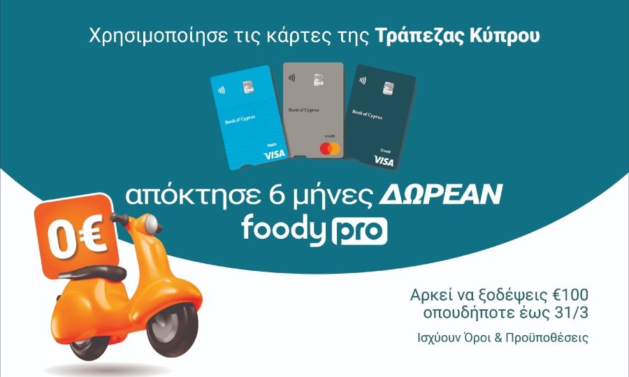 Πώς θα σου φαινόταν να απολάμβανες τις αγορές σου από τo Foody με €0 delivery fee και αποκλειστικές προσφορές για έξι μήνες; Τώρα, οι κάρτες της Τράπεζας Κύπρου γίνονται το «διαβατήριό» σου για τον κόσμο του Foody Pro! Το μόνο που έχεις να κάνεις είναι αγορές συνολικής αξίας τουλάχιστον €100 τον Μάρτιο σε σούπερ μάρκετ, αγαπημένα εστιατόρια, καφέ ή και οπουδήποτε αλλού και η 6μηνη δωρεάν συνδρομή γίνεται δική σου.