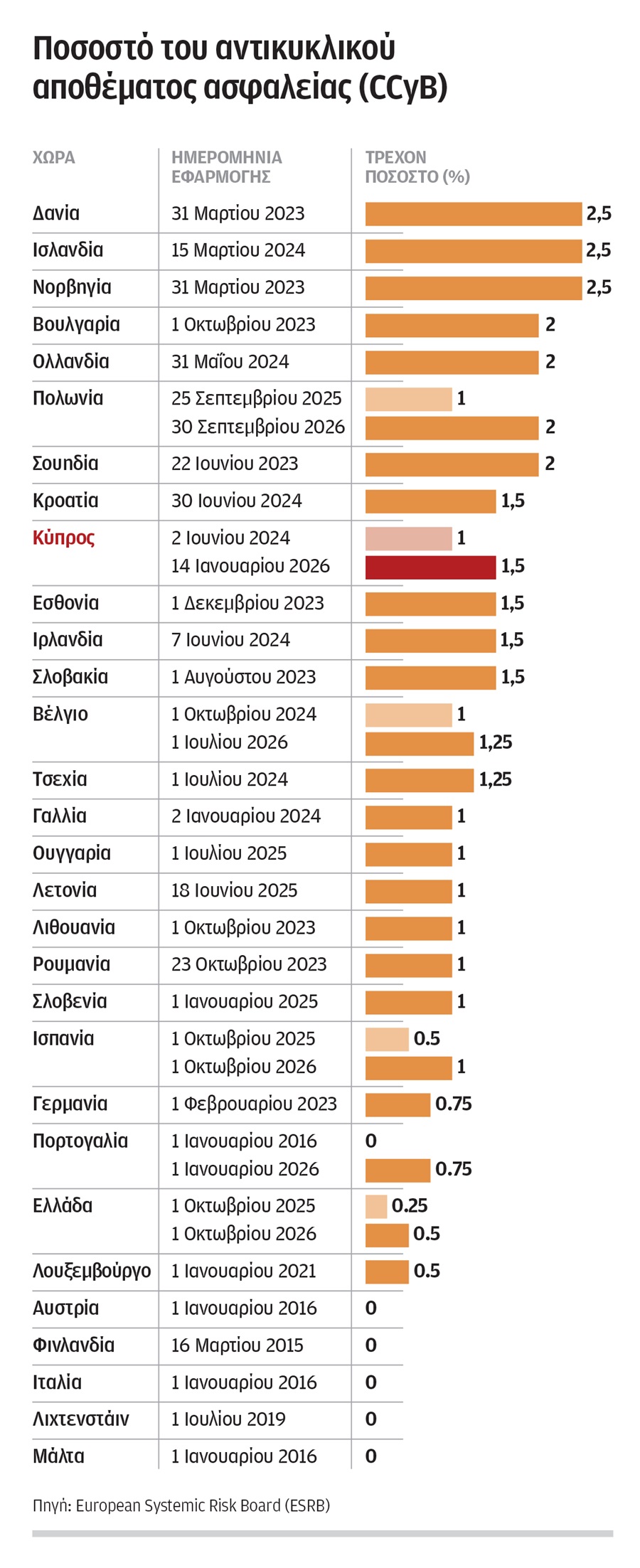 Συγκεκριμένα, η Κύπρος εφαρμόζει από τις 2 Ιουνίου 2024 CCyB στο 1%, ενώ έχει ήδη ανακοινωθεί περαιτέρω αύξηση στο 1,5% από τις 14 Ιανουαρίου 2026. Η κίνηση αυτή την ευθυγραμμίζει με χώρες όπως η Ιρλανδία, η Εσθονία, η Κροατία και η Σλοβακία, που κινούνται επίσης στο εύρος του 1,5%, ενώ δεν έχουν ανακοινώσει κάποια αύξηση αυτού του ποσοστού.