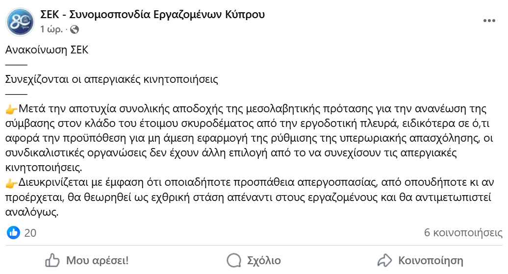 Μάλιστα, η ΣΕΚ σε επίσημη ανακοίνωσή της ξεκαθαρίζει πως οι απεργιακές κινητοποιήσεις συνεχίζονται «μετά την αποτυχία συνολικής αποδοχής της μεσολαβητικής πρότασης για την ανανέωση της σύμβασης στον κλάδο του έτοιμου σκυροδέματος από την εργοδοτική πλευρά». Επιπρόσθετα, αναφέρουν ότι «ειδικότερα σε ό,τι αφορά την προϋπόθεση για μη άμεση εφαρμογή της ρύθμισης της υπερωριακής απασχόλησης, οι συνδικαλιστικές οργανώσεις δεν έχουν άλλη επιλογή από το να συνεχίσουν τις απεργιακές κινητοποιήσεις».