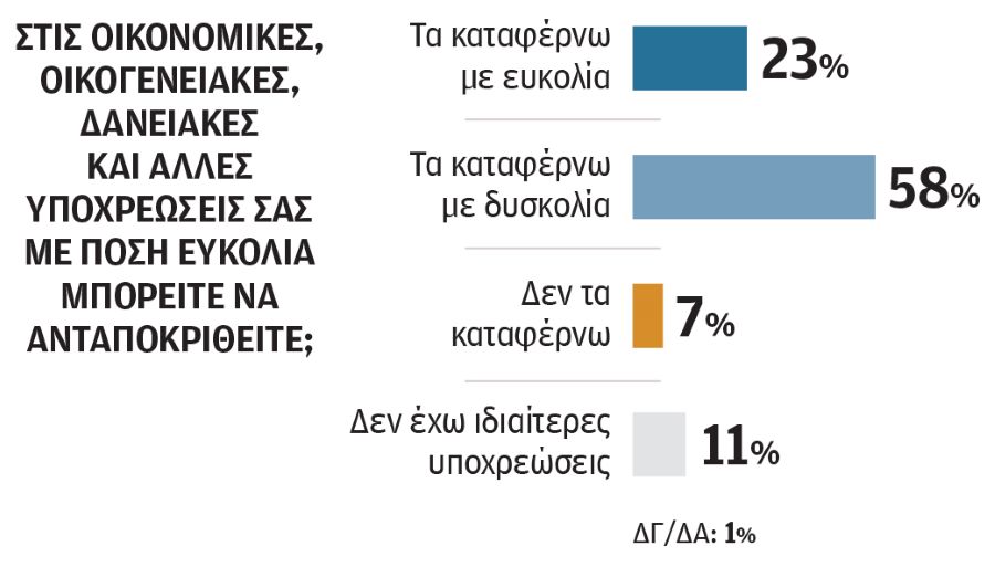 Η πίεση στην κοινωνία αντανακλάται και στην ικανότητα των νοικοκυριών να ανταποκριθούν στις δανειακές τους υποχρεώσεις. Το 58% δηλώνει ότι τα καταφέρνει με δυσκολία και ένα εντόνως ανησυχητικό 7% του δείγματος αναφέρει ότι δεν τα καταφέρνει. Με ευκολία δηλώνει ότι ανταποκρίνεται στις δανειακές του υποχρεώσεις το 23% και ένα 11% δηλώνει ότι δεν έχει ιδιαίτερες δανειακές υποχρεώσεις.