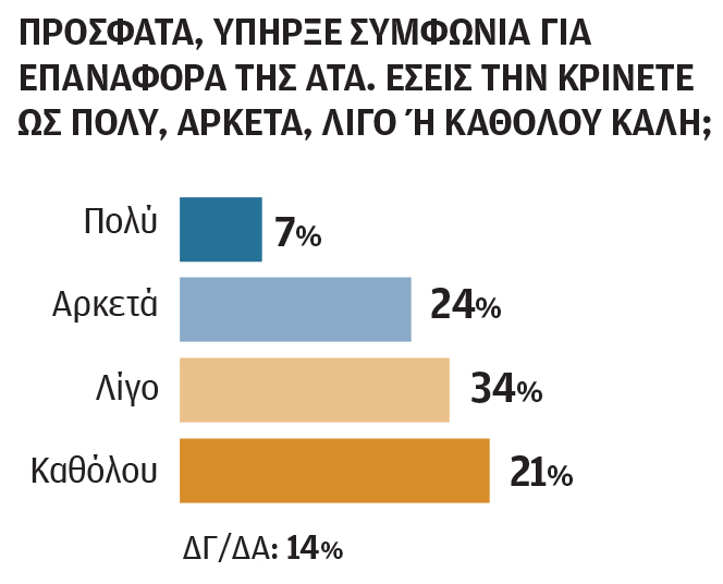 Σχετικά με την πρόσφατη συμφωνία της Αυτόματης Τιμαριθμικής Αναπροσαρμογής, το 21% των ερωτηθέντων την κρίνουν «καθόλου» καλή, ενώ το 34% την εκτιμά ως «λίγο» καλή. «Αρκετά» καλή την θεωρεί το 24% του δείγματος και ένα 7% την θεωρεί «πολύ» καλή. Το 14% δεν έχει άποψη επί του θέματος.