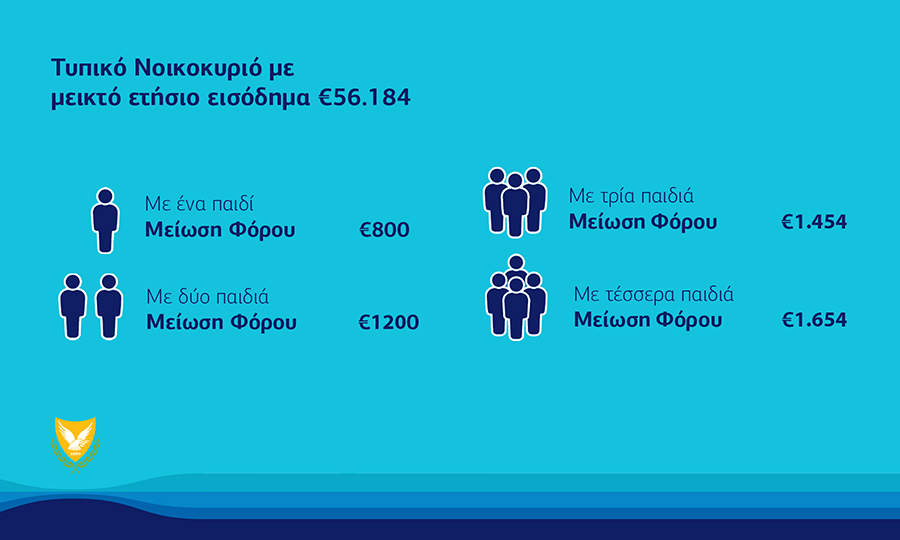 Η κ. Ανδρέου είπε ακόμη ότι για ένα τυπικό νοικοκυριό που έχει δύο εργαζομένους και δύο παιδιά, οι φορολογικές εκπτώσεις θα ανέρχονται μέχρι €5.500 και στις πιο πολλές περιπτώσεις αυτό οδηγεί σε μείωση φόρου που θα είναι περισσότερες από τις €5.000 αφορολόγητο.
