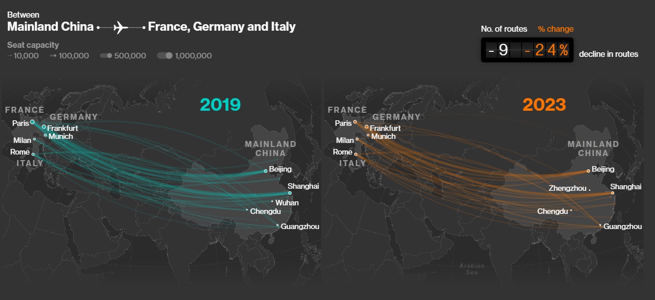 Στην Ευρώπη, τα στοιχεία του Bloomberg δείχνουν ότι τουλάχιστον το ένα τέταρτο των πόλεων που είχαν απευθείας πτήσεις προς την Κίνα, σήμερα δεν έχουν πια τέτοια πρόσβαση. Ανάμεσα στις πόλεις αυτές είναι η Πράγα, το Όσλο και η Νίκαια. Αντίστοιχη είναι και η μείωση των κινεζικών πόλεων που συνδέονται με απευθείας πτήσεις με την Ευρώπη.