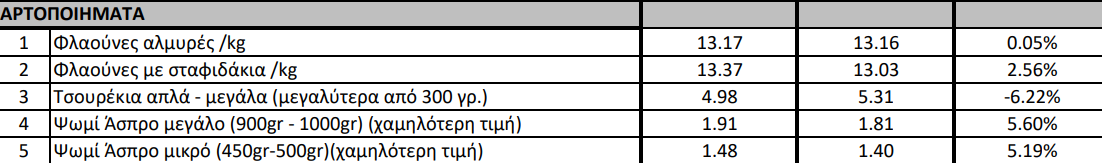 Όσον αφορά τις τιμές στα αρτοποιήματα, στις φλαούνες σημειώνεται μικρή αύξηση (0.05% οι αλμυρές), με εκείνες που περιέχουν σταφίδες να φτάνουν το 2.56%. Από την άλλη, πιο φθηνά θα στοιχίσουν φέτος τα τσουρέκια (μεγαλύτερα από 300 γρ.) αφού σημειώνουν μείωση 6.22% από 5,31 ευρώ πέρσι, στα 4.98 ευρώ φέτος. Πιο ψηλά βρίσκονται και οι τιμές στο ψωμί καθώς ανεβαίνει κατά 10 σεντς σημειώνοντας αύξηση 5.60%.