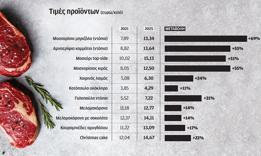 Από το 2021 έως το 2025, το κόστος του χριστουγεννιάτικου τραπεζιού έχει εκτοξευθεί, με τα μοσχάρια και τα αμνοερίφια να σπάνε ρεκόρ τιμών, τα παραδοσιακά γλυκά να ακριβαίνουν αισθητά και τα λαχανικά να ακολουθούν μικτό μοτίβο.