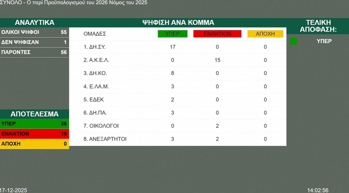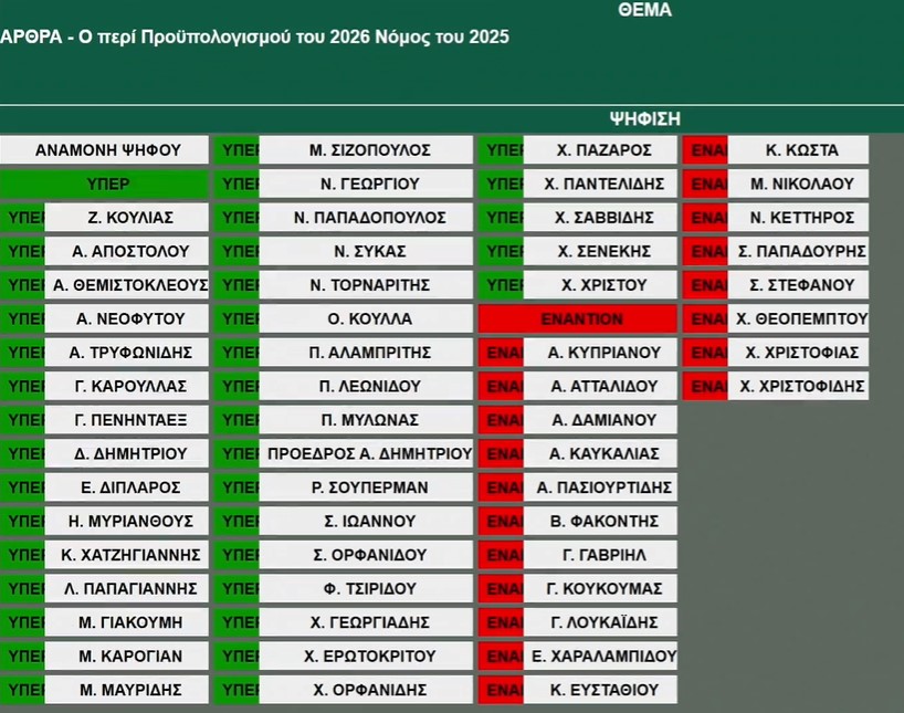 Με τις θετικές ψήφους του ΔΗΣΥ, του ΔΗΚΟ, του ΕΛΑΜ, της ΔΗΠΑ, της ΕΔΕΚ και του ανεξάρτητου Ανδρέα Θεμιστοκλέους και την καταψήφιση από ΑΚΕΛ και Οικολόγους, τον μεμονωμένο Σοσιαλιστή Βουλευτή Κώστα Ευσταθίου και την ανεξάρτητη Αλεξάνδρα Ατταλίδου, εγκρίθηκε από την Ολομέλεια την Τετάρτη ο κρατικός προϋπολογισμός για το 2026, που αποτελεί την κορυφαία νομοθετική πράξη της Βουλής.