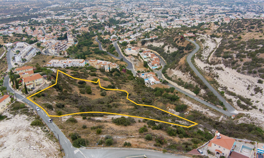 Το ακίνητοι βρίσκεται σε ύψωμα στον δήμο Πέγειας. Έχει ακανόνιστο σχήμα, επικλινή επιφάνεια με θέα προς τη θάλασσα και τη γύρω περιοχή. Η ευρύτερη περιοχή είναι οικιστική με μέσου επιπέδου κατοικίες και δεν έχει αναπτυχθεί πλήρως ακόμα. Έχει καλή προσβασιμότητα τόσο προς το κέντρο του Δήμου όσο και τις υπόλοιπες περιοχές της Πάφου. Υπόκειται σε ΦΠΑ.