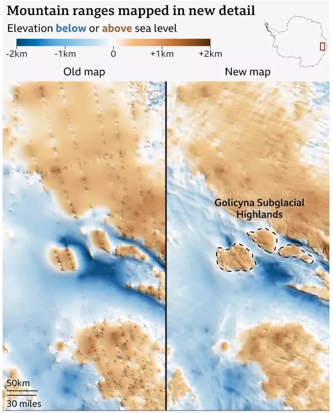 Παρότι γνωρίζαμε τις μεγάλες οροσειρές της Ανταρκτικής, η νέα προσέγγιση των επιστημόνων αποκάλυψε δεκάδες χιλιάδες έως τώρα άγνωστους λόφους και ράχες, καθώς και πολύ μεγαλύτερη λεπτομέρεια γύρω από βουνά και φαράγγια που βρίσκονται θαμμένα κάτω από τον πάγο.