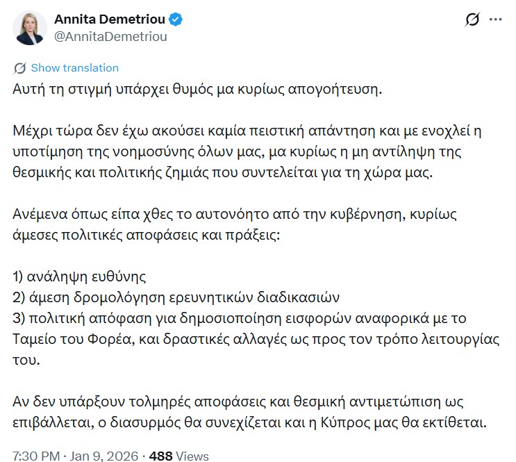 «Αυτή τη στιγμή υπάρχει θυμός μα κυρίως απογοήτευση. Μέχρι τώρα δεν έχω ακούσει καμία πειστική απάντηση και με ενοχλεί η υποτίμηση της νοημοσύνης όλων μας, μα κυρίως η μη αντίληψη της θεσμικής και πολιτικής ζημιάς που συντελείται για τη χώρα μας. Ανέμενα όπως είπα χθες το αυτονόητο από την κυβέρνηση, κυρίως άμεσες πολιτικές αποφάσεις και πράξεις: 1) ανάληψη ευθύνης 2) άμεση δρομολόγηση ερευνητικών διαδικασιών 3) πολιτική απόφαση για δημοσιοποίηση εισφορών αναφορικά με το Ταμείο του Φορέα, και δραστικές αλλαγές ως προς τον τρόπο λειτουργίας του. Αν δεν υπάρξουν τολμηρές αποφάσεις και θεσμική αντιμετώπιση ως επιβάλλεται, ο διασυρμός θα συνεχίζεται και η Κύπρος μας θα εκτίθεται.»