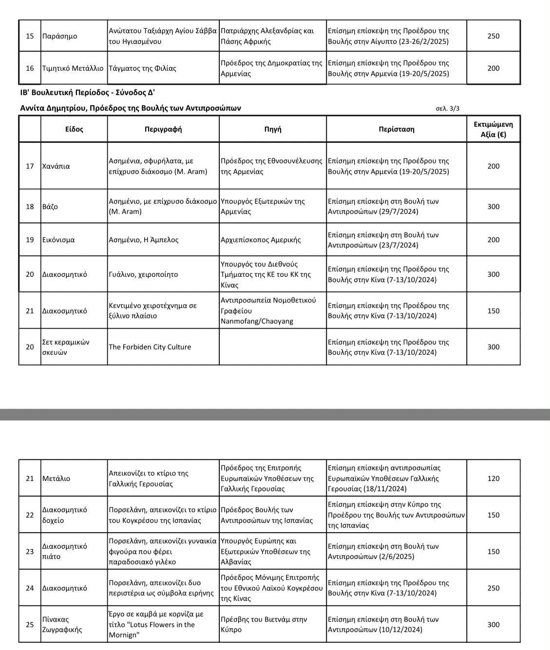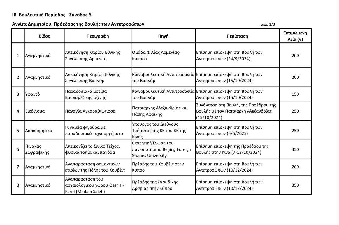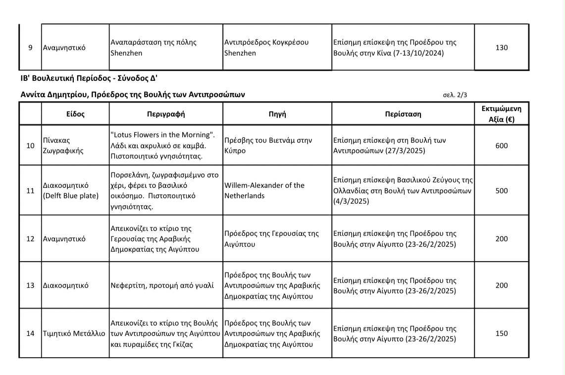 Στην δημοσιότητα έδωσε η Πρόεδρος της Βουλής Αννίτα Δημητρίου τα δώρα που έλαβε από ξένους φορείς για την Βουλευτική Περίοδος - Σύνοδος Δ', δηλαδή από τον Ιούλιο 2024 μέχρι και τον Σεπτέμβριο του περασμένου έτους.