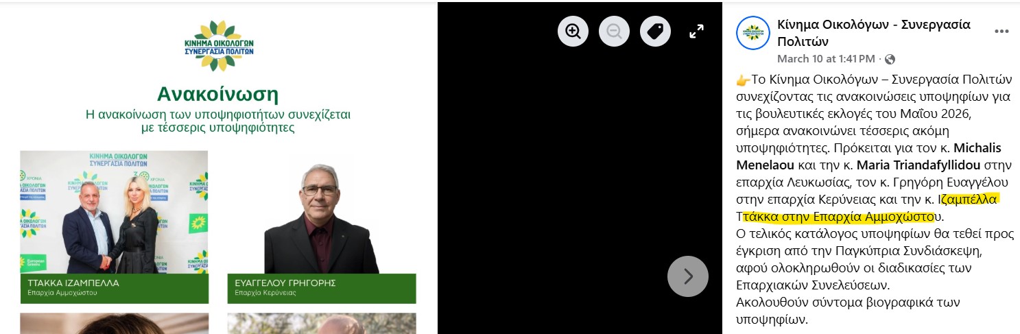 Μάλιστα σε ανάρτηση των Οικολόγων στον Facebook στις 10 Μαρτίου, είχε ανακοινωθεί η συγκεκριμένη υποψήφια για το ψηφοδέλτιο του κόμματος στην Επαρχία Λευκωσίας για τις επερχόμενες βουλευτικές εκλογές.