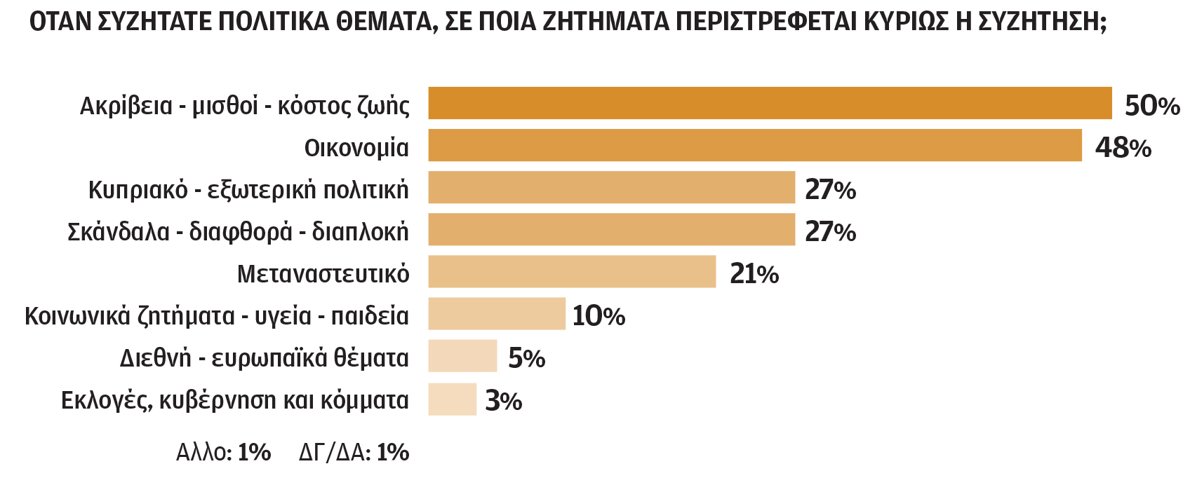 Την απαισιόδοξη εικόνα επικυρώνει η ακτινογραφία των ζητημάτων που απασχολούν τους πολίτες. Ακρίβεια και κόστος ζωής (50%), καθώς και η πορεία της οικονομίας (48%) κυριαρχούν. Ακολουθούν το Κυπριακό (27%), μεταναστευτικό (21%), κοινωνικά ζητήματα, υγεία, παιδεία (10%). Αξιοσημείωτη η μεγάλη πτώση της διαφθοράς στο 27%, από το 43% τρεις μήνες πριν.