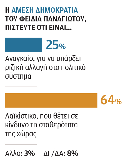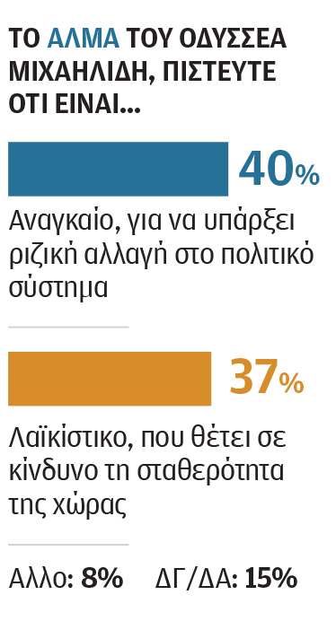 Το Άλμα του Οδυσσέα Μιχαηλίδη έχει πληγεί τόσο από τα γεγονότα των τελευταίων εβδομάδων, όσο και από την εμφάνιση της Άμεσης Δημοκρατίας. Έχει σημαντική υποχώρηση από τα ποσοστά Σεπτεμβρίου, επαναβεβαιώνοντας ότι η δυναμική των νέων κομμάτων είναι απρόβλεπτη. Με τον ίδιο φακό θα πρέπει να αντιμετωπίζονται και τα ποσοστά της Άμεσης Δημοκρατίας του Φειδία Παναγιώτου, ο οποίος σήμερα καταγράφει 8% και δείχνει να παλεύει για την τέταρτη θέση. Για τα δύο αυτά κόμματα ρωτήσαμε αν οι πολίτες τα θεωρούν αναγκαία για να υπάρξει αλλαγή ή λαϊκίστικα που θέτουν σε κίνδυνο τη σταθερότητα. Για το μεν Άλμα, οι γνώμες είναι διχασμένες (40% έναντι 37%), ενώ την Άμεση Δημοκρατία αναγκαία τη θεωρεί το 25% και λαϊκίστικη το 64%. Παραμένει στοίχημα και των δύο σχηματισμών η κατάρτιση αξιόλογου ψηφοδελτίου, αντικείμενο στο οποίο αντιμετωπίζουν ζητήματα.