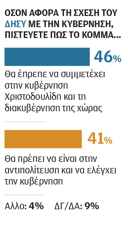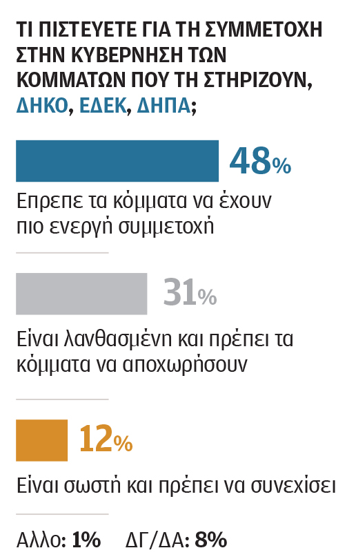 Αντίστοιχα, ρωτήσαμε για τα συγκυβερνώντα κόμματα, εάν η συμμετοχή τους στην κυβέρνηση είναι σωστή, πρέπει να είναι πιο ενεργή ή αν είναι λανθασμένη. Η πλειοψηφία (48%) πιστεύει ότι ΔΗΚΟ, ΕΔΕΚ και ΔΗΠΑ θα έπρεπε να έχουν πιο ενεργή συμμετοχή στη διακυβέρνηση. Ο ανασχηματισμός της περασμένης Παρασκευής διαθέτει τέτοια χαρακτηριστικά και θα πρέπει να αναμένουμε αν θα έχει αντίκτυπο στα κομματικά ποσοστά. Το ΔΗΚΟ, παραμένει καθηλωμένο, αλλά σε μικρή απόσταση πλέον από την τέταρτη θέση.
