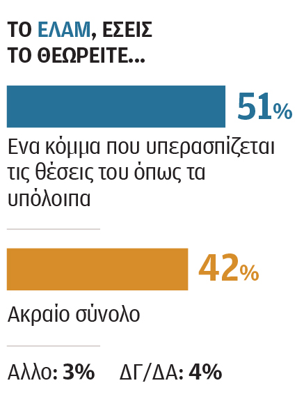 Το ΕΛΑΜ σταθεροποιείται στο 14%, δυνατό στους άντρες (17% έναντι 10% στις γυναίκες), τους νέους μέχρι 40 ετών (16%) και την Αμμόχωστο (31%). Είναι το φαβορί για την τρίτη θέση, έχοντας κανονικοποιηθεί στη συνείδηση των πολιτών. Το 51% το θεωρεί ως ένα κόμμα όπως τα υπόλοιπα, ενώ το 42% το θεωρεί ακραίο σύνολο. Η επιλογή του πολιτικού συστήματος να το αφήνει εκτός της αντιπαράθεσης επιχειρημάτων, μάλλον το ευνοεί αντί να το εμποδίζει.