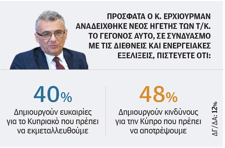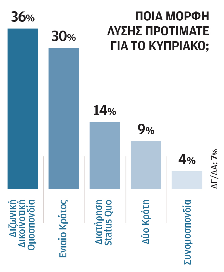 Στο Κυπριακό, ενώ αχνοφαίνεται μια νέα πρωτοβουλία, η κατάσταση στην κοινή γνώμη είναι ασαφής. Η εκλογή Ερχιουρμαν φέρνει διχογνωμία, το 40% πιστεύει ότι δημιουργεί νέα ευκαιρία και το 48% κινδύνους. Ίδια εικόνα και ως προς το ποια λύση θέλουμε. Το 36% τάσσεται υπέρ της Ομοσπονδίας, το 30% του ενιαίου κράτους, το 14% της παρούσας κατάστασης, το 9% των δύο κρατών και το 4% της Συνομοσπονδίας. Οι χειρισμοί της κυβέρνησης στο Κυπριακό ικανοποιούν μόλις το 34% των πολιτών σε αντίθεση με το 61% που δεν παρουσιάζεται ικανοποιημένο.
