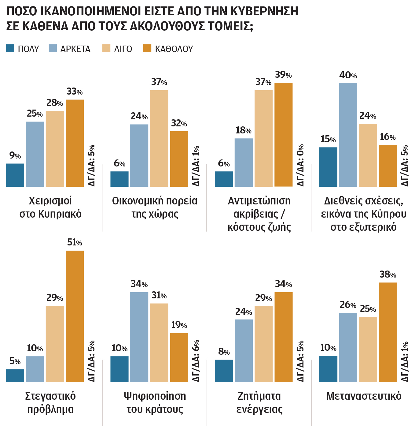 Η εξωτερική πολιτική και η εικόνα της Κύπρου στο εξωτερικό παραμένουν το μεγάλο ατού της κυβέρνησης (55% ικανοποίηση), ενώ στο μεταναστευτικό απολαμβάνει 36%. Αχίλλειος πτέρνα η αντιμετώπιση της ακρίβειας (24% ικανοποίηση) και το στεγαστικό (μόλις 15%).