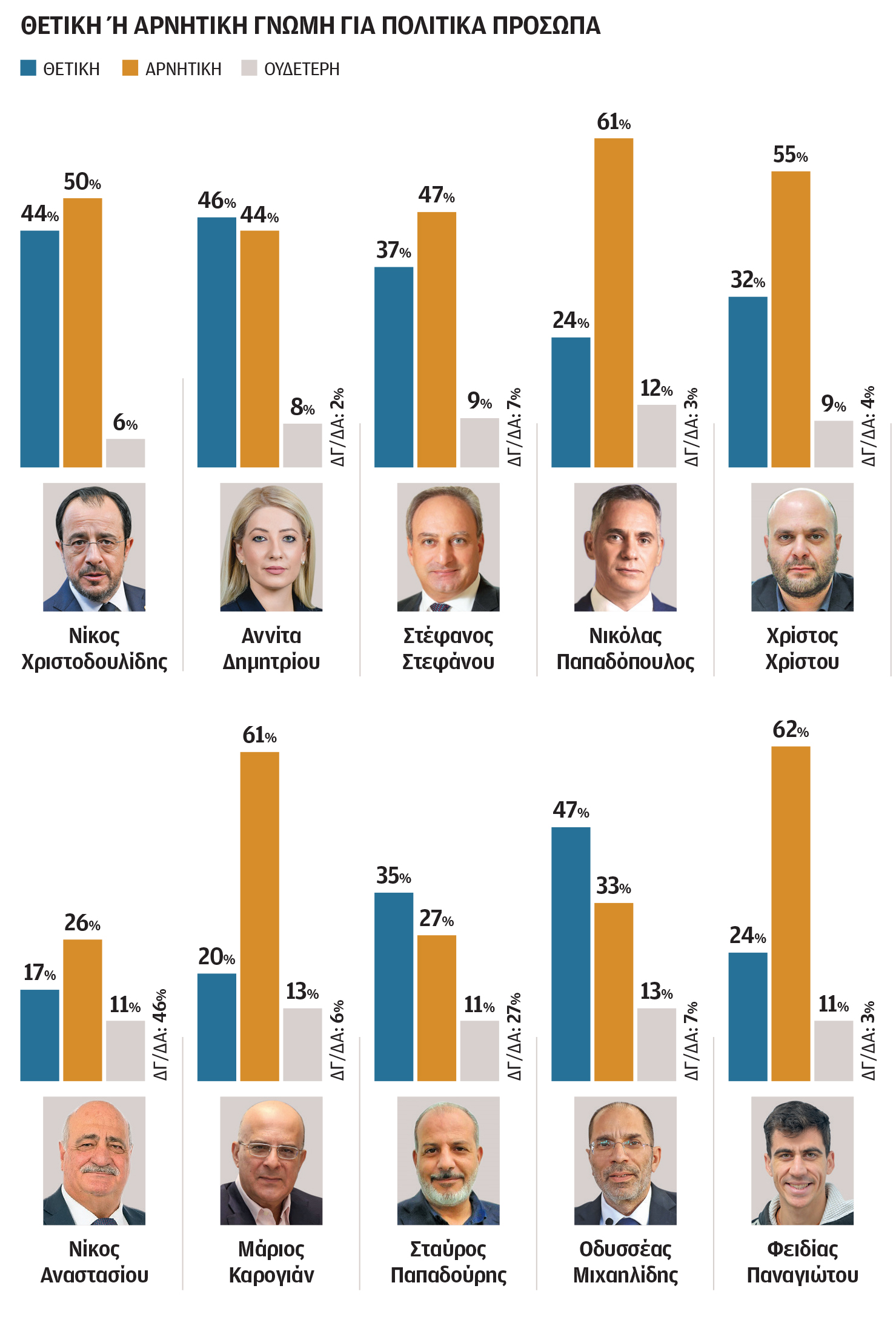 Ο πρόεδρος Χριστοδουλίδης απολαμβάνει 44% θετικής και 50% αρνητικής δημοτικότητας, βελτιωμένος κατά 4%. Βελτίωση παρουσιάζει και το ισοζύγιο της προέδρου του ΔΗΣΥ Αννίτας Δημητρίου, με 46% θετικές γνώμες και 44% αρνητικές (63% θετική και 30% αρνητική γνώμη στον ΔΗΣΥ).