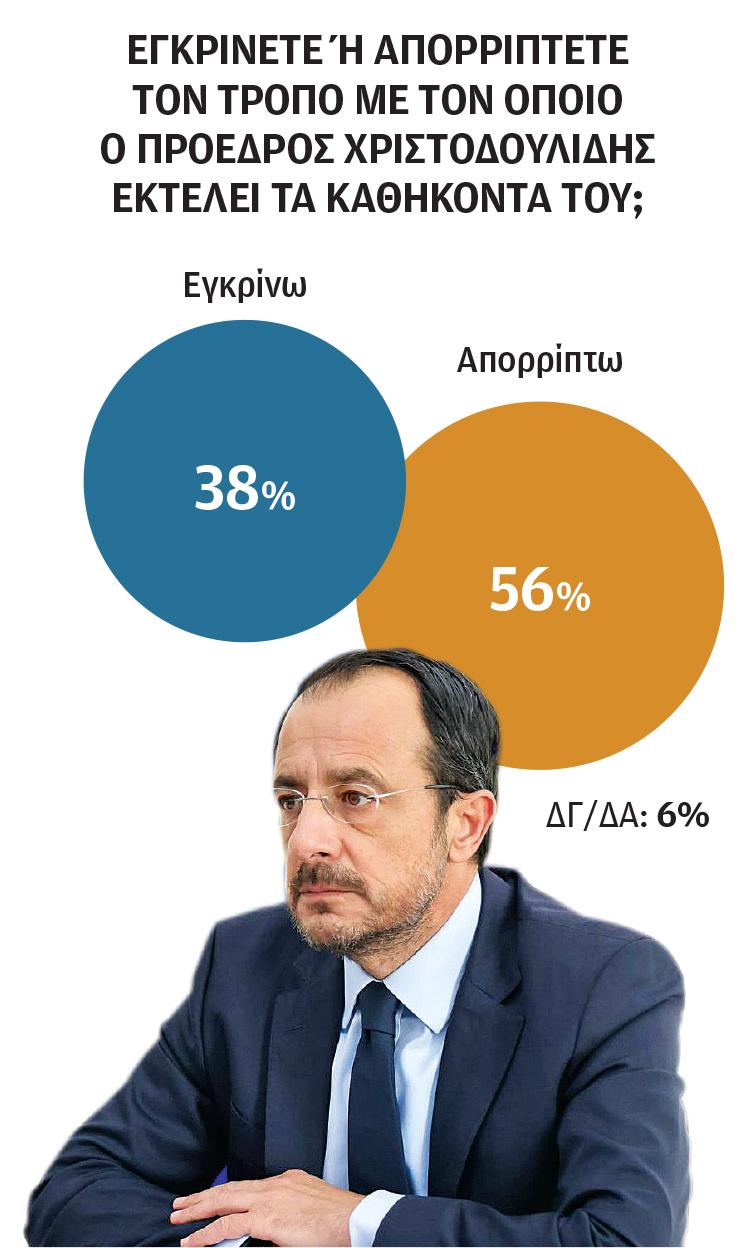 Τον τρόπο με τον οποίο ο πρόεδρος Χριστοδουλίδης εκτελεί τα καθήκοντά του εγκρίνει το 38% και 56% τον απορρίπτει. Ταυτόχρονα, 34% των πολιτών δηλώνουν πολύ ή αρκετά ικανοποιημένοι από την απόδοση της σημερινής κυβέρνησης και 66% λίγο ή καθόλου, ελαφρώς βελτιωμένο (+5%) σε σχέση με τον Σεπτέμβριο. Αποδοχή η κυβέρνηση απολαμβάνει στους ψηφοφόρους του ΔΗΚΟ (56%), στον ΔΗΣΥ έχει 40% θετικές και 60% αρνητικές κρίσεις, στο ΑΚΕΛ 21% θετικές και 79% αρνητικές και στο ΕΛΑΜ 34% θετικές και 66% αρνητικές.