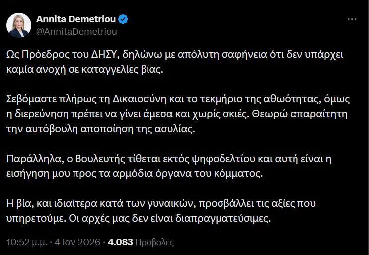 Υπενθυμίζεται πως με ανάρτηση της στο Χ, η Πρόεδρος του κόμματος Αννίτα Δημητρίου γνωστοποίησε ότι o συγκεκριμένος βουλευτής είναι εκτός ψηφοδελτίου, ενώ τον κάλεσε να αποποιηθεί την βουλευτική του ασυλία, μετά από καταγγελία εις βάρος του από τη σύντροφό του για ξυλοδαρμό.