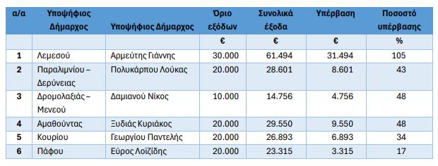 Κατά τον έλεγχο, "διαπιστώσαμε ότι τα συνολικά έξοδα που δήλωσαν οι πιο κάτω υποψήφιοι Δήμαρχοι, σύμφωνα με τις ΕΕΕ, υπερβαίνουν τα ανώτατα όρια που καθορίζονται στον περί Δήμων Νόμο".