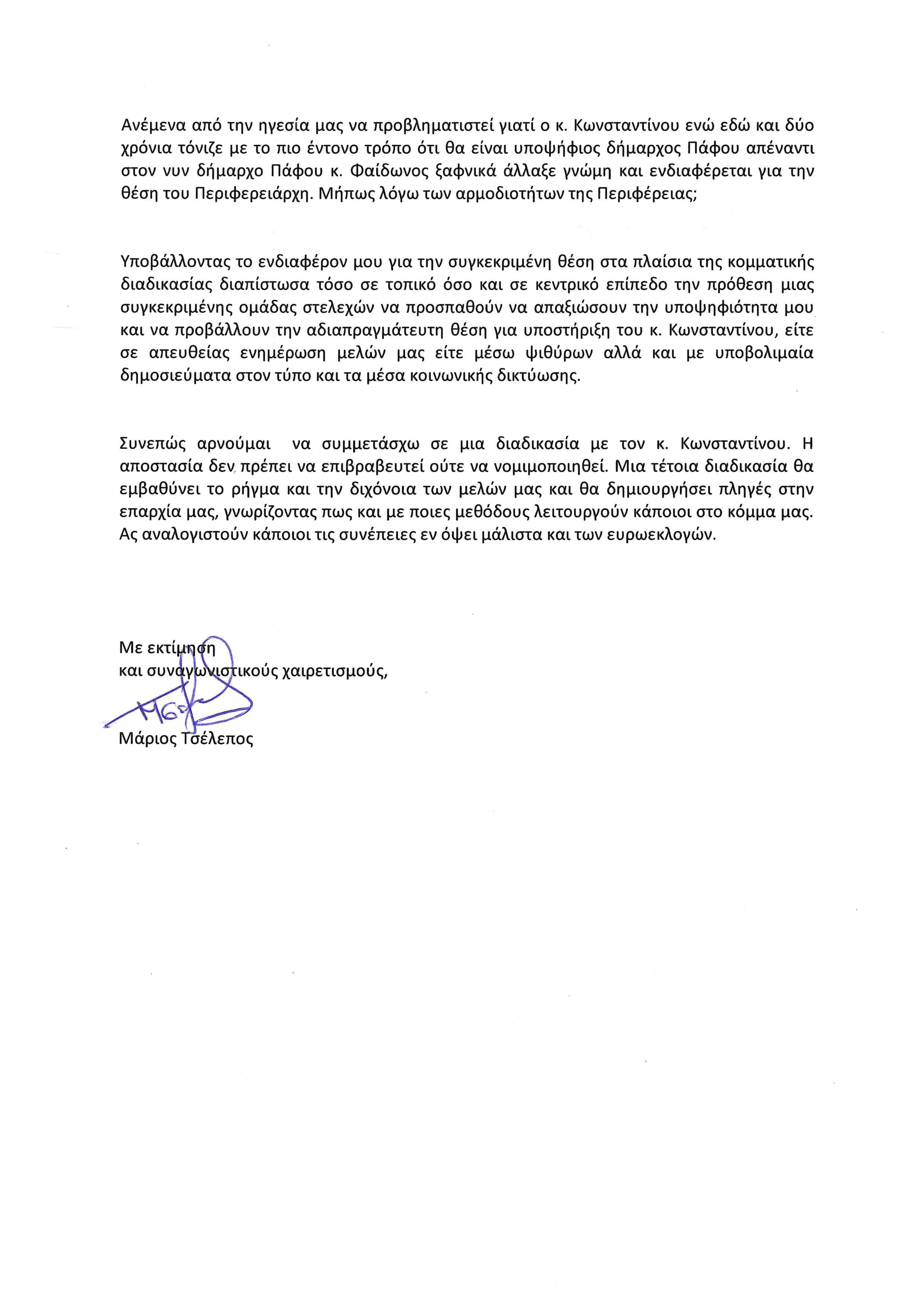 Θυμίζουμε ότι με επιστολή του προς την ηγεσία του Δημοκρατικούς Συναγερμού, εκφράζοντας την απογοήτευση του για την απόφαση του κόμματος για διενέργεια εσωκομματικών εκλογών στην επαρχία Πάφου. Ο κύριος Τσέλεπος αναφέρει ότι πέραν από το προσωπικό του ενδιαφέρον για την θέση του Περιφερειάρχη ενδιαφέρον για την θέση έχει εκδηλώσει και ο τέως βουλευτής του ΔΗΣΥ Κωστάκης Κωνσταντίνου όποιος όπως τονίζει γύρισε την πλάτη του στο κόμμα στηρίζοντας τον Νίκο Χριστοδουλίδη.