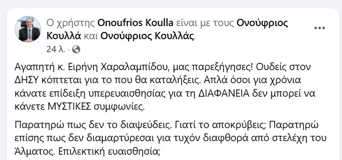 Σε ανάρτηση του στο facebook o κ. Κουλλά τόνισε πως «αγαπητή κ. Ειρήνη Χαραλαμπίδου, μας παρεξήγησες! Ουδείς στον ΔΗΣΥ κόπτεται για το που θα καταλήξεις. Απλά όσοι για χρόνια κάνατε επίδειξη υπερευαισθησίας για τη ΔΙΑΦΑΝΕΙΑ δεν μπορεί να κάνετε ΜΥΣΤΙΚΕΣ συμφωνίες», προσθέτοντας ότι «παρατηρώ πως δεν το διαψεύδεις. Γιατί το αποκρύβεις; Παρατηρώ επίσης πως δεν διαμαρτύρεσαι για τυχόν διαφθορά από στελέχη του Άλματος. Επιλεκτική ευαισθησία;».