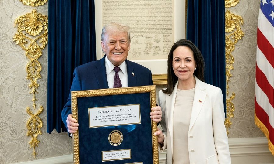Η βραβευμένη με το Νόμπελ Ειρήνης του 2025, ηγέτιδα της αντιπολίτευσης της Βενεζουέλας Μαρία Κορίνα Ματσάδο, παρέδωσε χθες Πέμπτη το μετάλλιο του Νόμπελ Ειρήνης που της απονεμήθηκε στον Τραμπ, ο οποίος την ευχαρίστησε γι' αυτό.