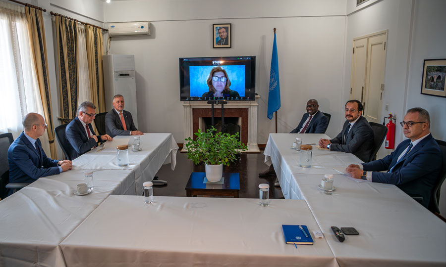 Έξι πρόσωπα στη συνάντηση με τη συμμετοχή της κ. Ολγκίν διαδικτυακά / Πηγή X: UN Cyprus